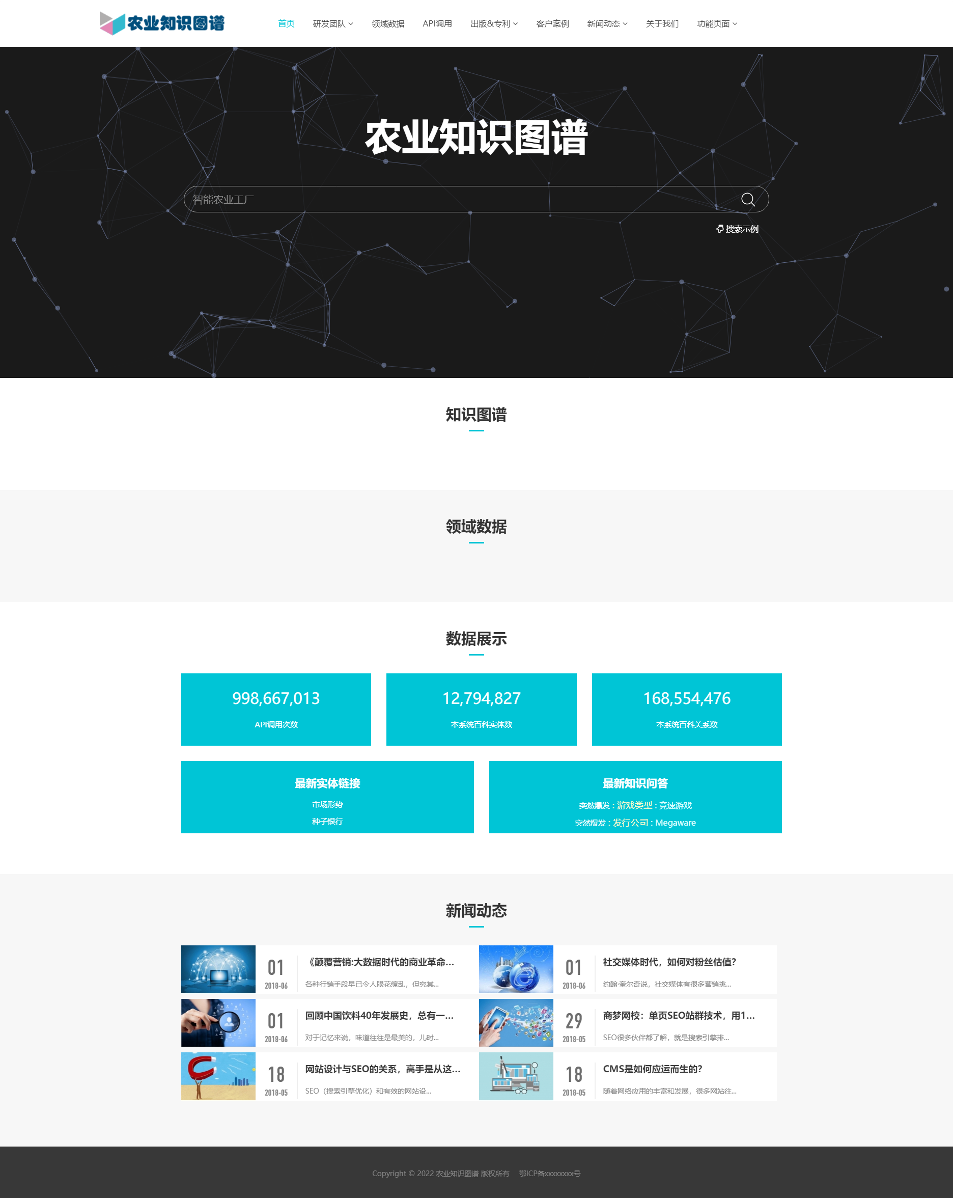农业知识图谱科研项目网站 2021.11-2021.12 发布日期: 2020-05-09 15:01 阅读量: 994 来源: 互联网 上一篇: 方芯科技公司企业网站 下一篇: 大学二级单位目标管理与绩效考核管理系统2021.12-2021.1 随便看看 让客户留住更长时间访问你的网站 发布日期: 2019-02-18 移动网站需要吸引哪些观众并将其转化为客户 发布日期: 2019-02-18 空壳网站是什么?如何避免成为空壳网站?空壳网站怎么处理? 发布日期: 2019-02-18 单位或网站涉及金融类关键词,办理网站备案注意事项 发布日期: 2019-02-18 个人建设网站有哪些步骤? 发布日期: 2019-02-18