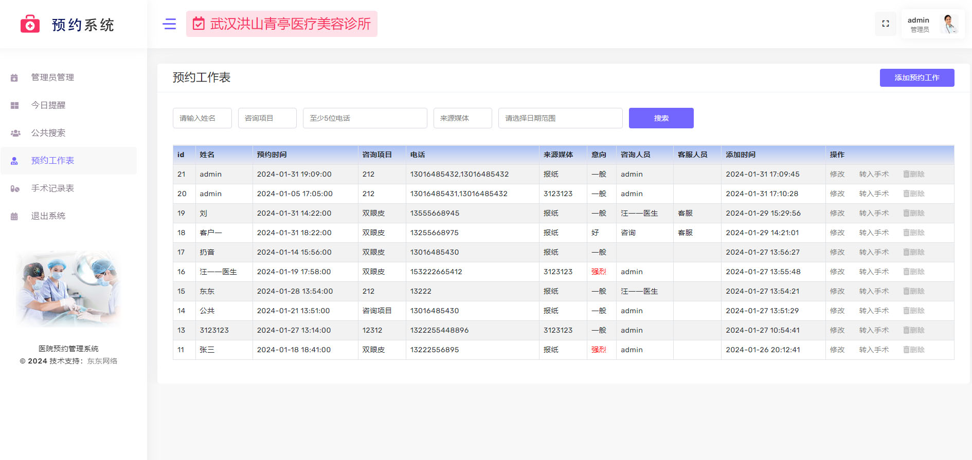 整形医院预约管理系统php版2024.1 发布日期: 2024-01-31 19:51 阅读量: 875 来源: 互联网 上一篇: 大学二级单位目标管理与绩效考核管理系统2021.12-2021.1 下一篇: 外贸网站-- 美舍贸易及顾问(香港)有限公司2020 随便看看 让客户留住更长时间访问你的网站 发布日期: 2019-02-18 移动网站需要吸引哪些观众并将其转化为客户 发布日期: 2019-02-18 空壳网站是什么?如何避免成为空壳网站?空壳网站怎么处理? 发布日期: 2019-02-18 单位或网站涉及金融类关键词,办理网站备案注意事项 发布日期: 2019-02-18 个人建设网站有哪些步骤? 发布日期: 2019-02-18